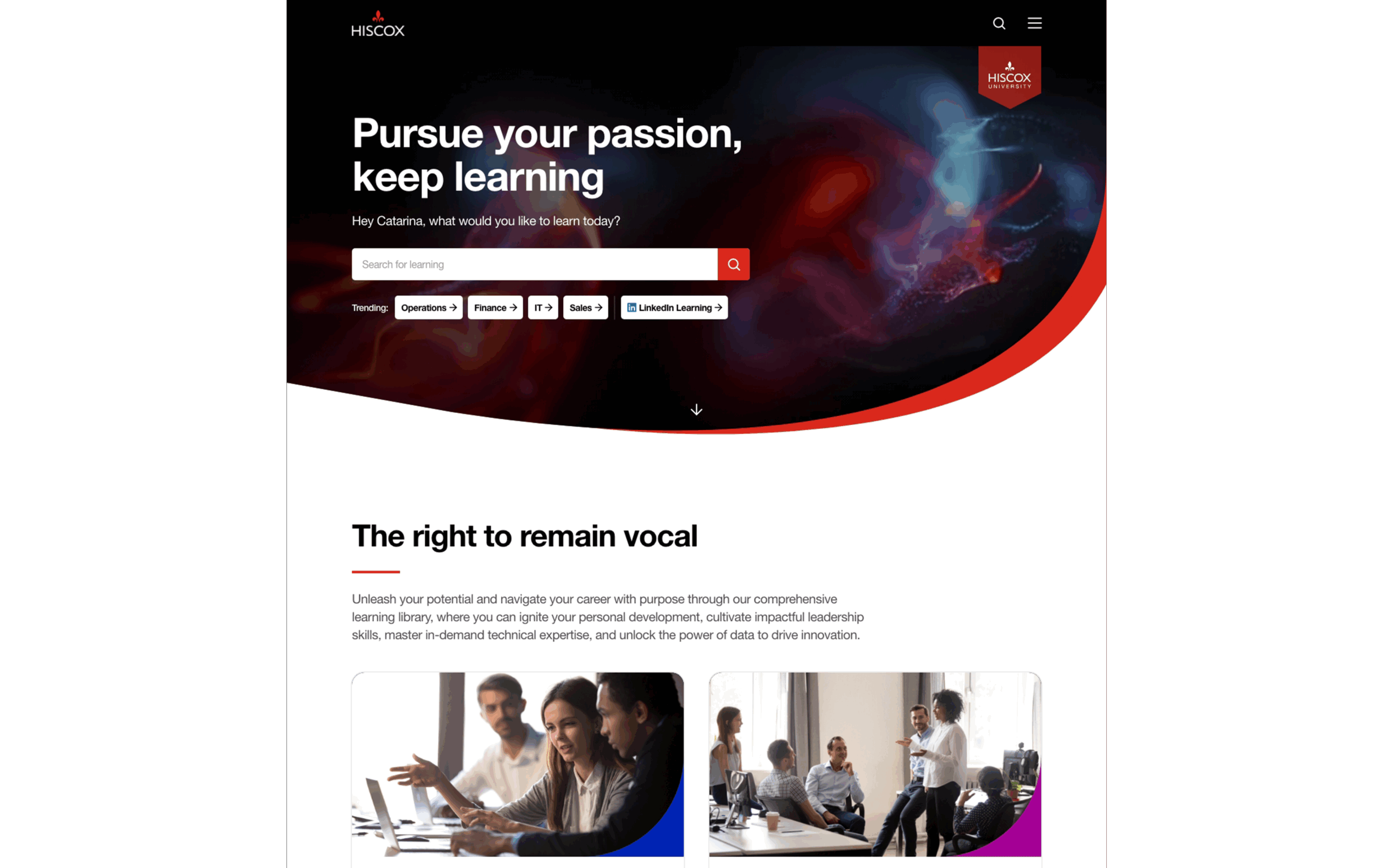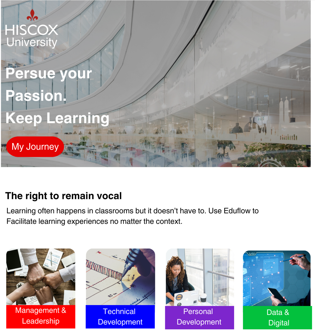 Hiscox has a learning culture, but their existing LMS didn’t reflect it. The standard Cornerstone interface felt disconnected from the Hiscox brand, creating a divide between their high-quality content and the user experience. To drive engagement beyond mandatory training, they needed a platform that felt like an inspiring destination, not just a compliance tool.